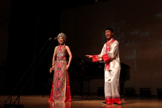 本网讯 近日,我校土家族学子舒乐“妙乐心曲”毕业独唱音乐会在艺术楼小剧场隆重举行,第十四届青年歌手电视大奖赛原生态唱法金奖得主谭学聪作为特邀嘉宾来到现场和舒乐同台演出。
