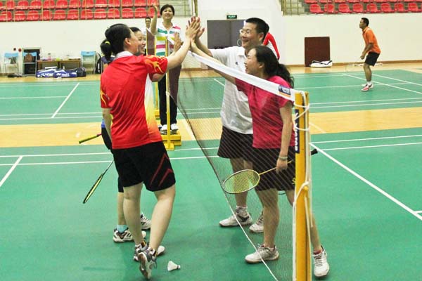 仲伟合亲自上场,与我校前羽球队队员组成搭档对阵两位奥运冠军。球场上,杨维和张洁雯这两位前奥运冠军配合完美,应对轻松。而我校这边亦不甘示弱,两人皆反应迅速,扣杀有力,配合默契。场上气氛紧张却又不失欢乐,不时传来阵阵笑声,精彩的对阵引来不少师生的围观。刘建达以及个别队员也分别与张洁雯进行了练习赛,张洁雯对队员们进行了相应的指导。