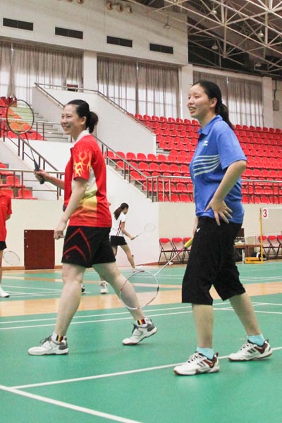 本网讯 6月10日,2004年奥运羽毛球女双冠军杨维和张洁雯前来我校指导羽毛球工作,我校校长仲伟合接待了两位国手并上球场与两位国手切磋一番。我校副校长刘建达、何传添,体育部主任林少娜、书记李旭武等也参加了该次交流活动。
