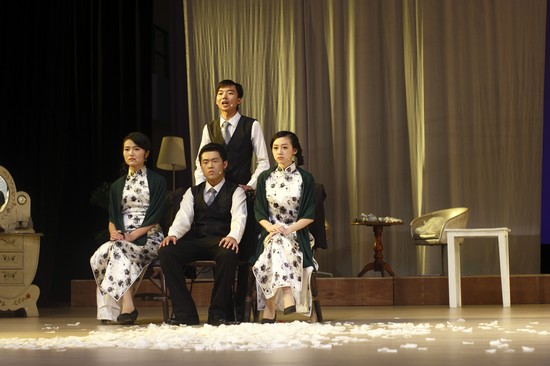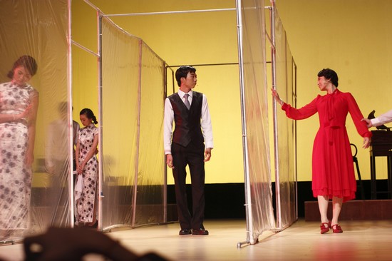 旗袍、老式留声机、琵琶古乐,简单的场景布置再现了张爱玲笔下红白流苏的老上海风情。话剧对故事的主人公,“红玫瑰”(王娇蕊)与“白玫瑰”(孟烟鹂)和男主角佟振保均独具创意地引入了“二人共饰一角”的表演技法,即一人饰演现实中的人物,另一人表演人物的内心活动。两个演员之间不仅动作上保持一致,不少台词更保持同步,一里一外的配合体现出人物复杂的内心挣扎。