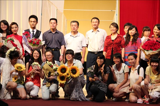 本网讯 “娶了红玫瑰,久而久之,红的变了墙上的一抹蚊子血,白的还是‘床前明月光’。”爱情与婚姻之间,孰是孰非?6月7日晚上,话剧《红玫瑰与白玫瑰》在云山会堂上演。我校副校长顾也力、校团委副书记陈兵、中文学院党委书记李和民、副院长魏慧斌、党委副书记李江等出席了展演。
