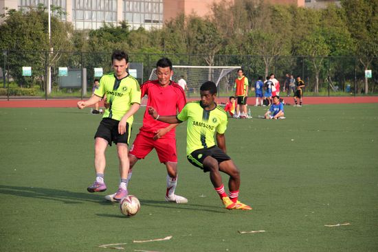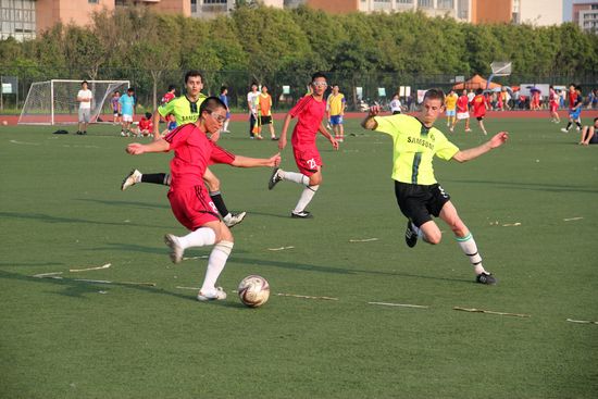 比赛在下午4:30准时开始,首先是留学生队开球。在比赛开始阶段,留学生队凭借着出色的身体素质与个人能力率先向经贸学院发难,频频突入到对方腹地,并且完成射门,但是射门质量并不是很高,并没有对经贸学院造成实质性威胁。随着比赛的深入,比赛局势变得胶着起来,双方你来我往,互有攻守。当比赛进行到20分钟时,经贸学院8号符兆强右路得球后强行突破,下底传中,9号哈吉及时插上包抄,可惜射门滑门而出,这是上半场双方出现的最好的破门机会。上半场双方打成0:0平手,留学生学院队在场上略占上风。