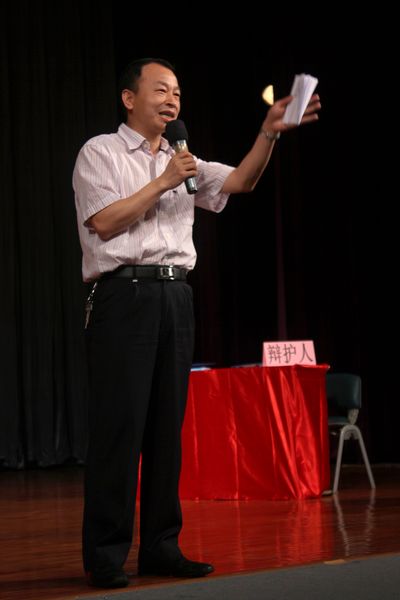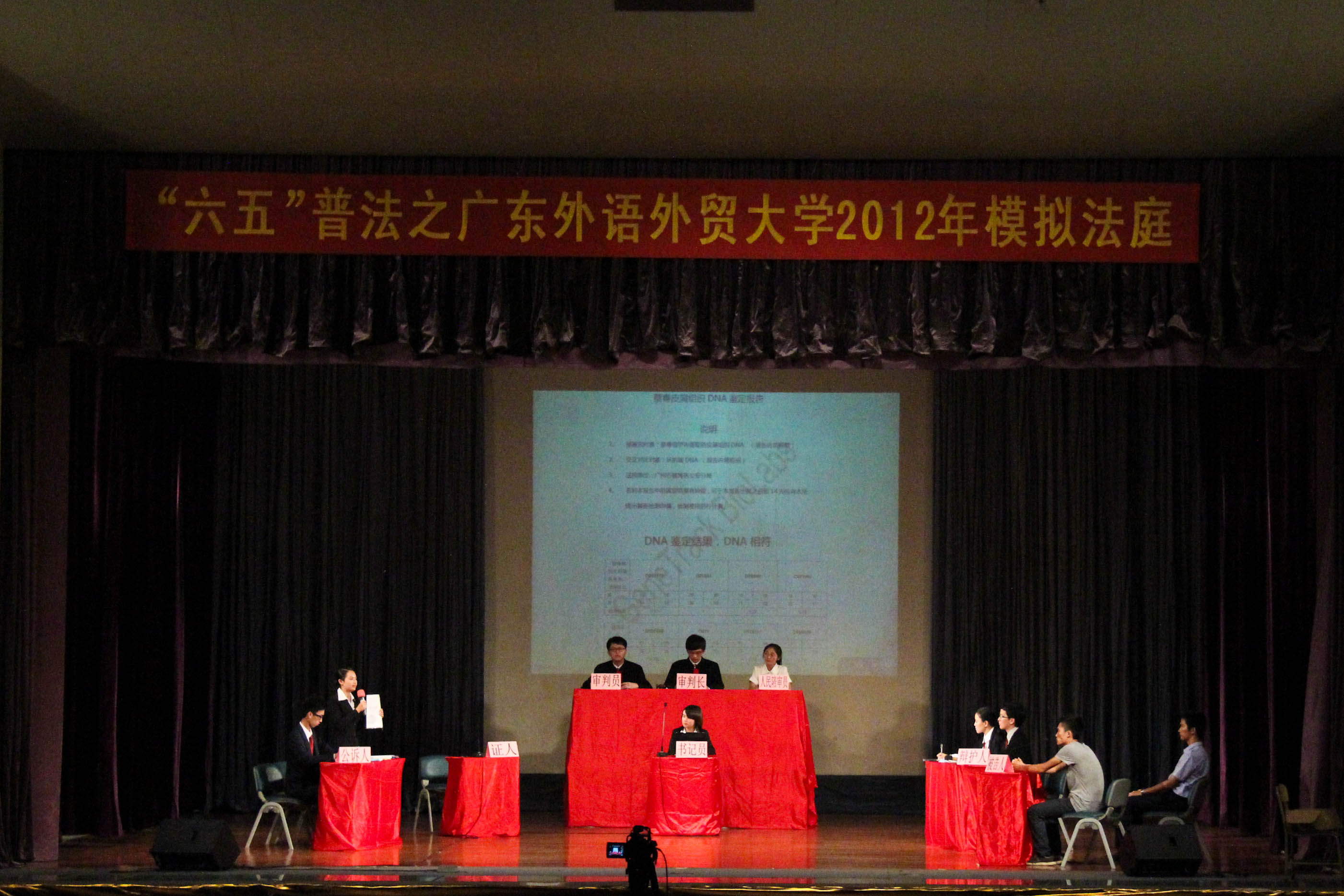 本网迅 5月16日晚,“六五”普法之广外2012年模拟法庭公演在南校区B8学术报告厅举行。校党委宣传部副部长陈红霞,校团委副书记国佳,法学院副院长龙著华,法学院党委副书记卢海清、法学院众老师以及各兄弟院校的嘉宾等出席了此次公演,与现场观众一同见证了这场仿真审判。