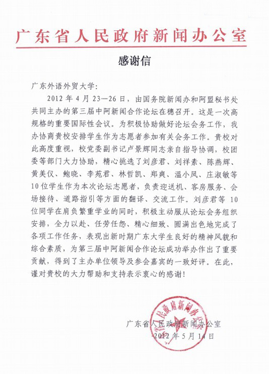 本网讯 4月23日-26日,第三届中阿新闻合作论坛在广州召开。应省府新闻办要求,我校派出刘彦君等十位同学作为志愿者参加论坛会务工作。十位同学全力以赴,出色完成了各项工作任务。近日,省府新闻办为此给我校发来感谢信。