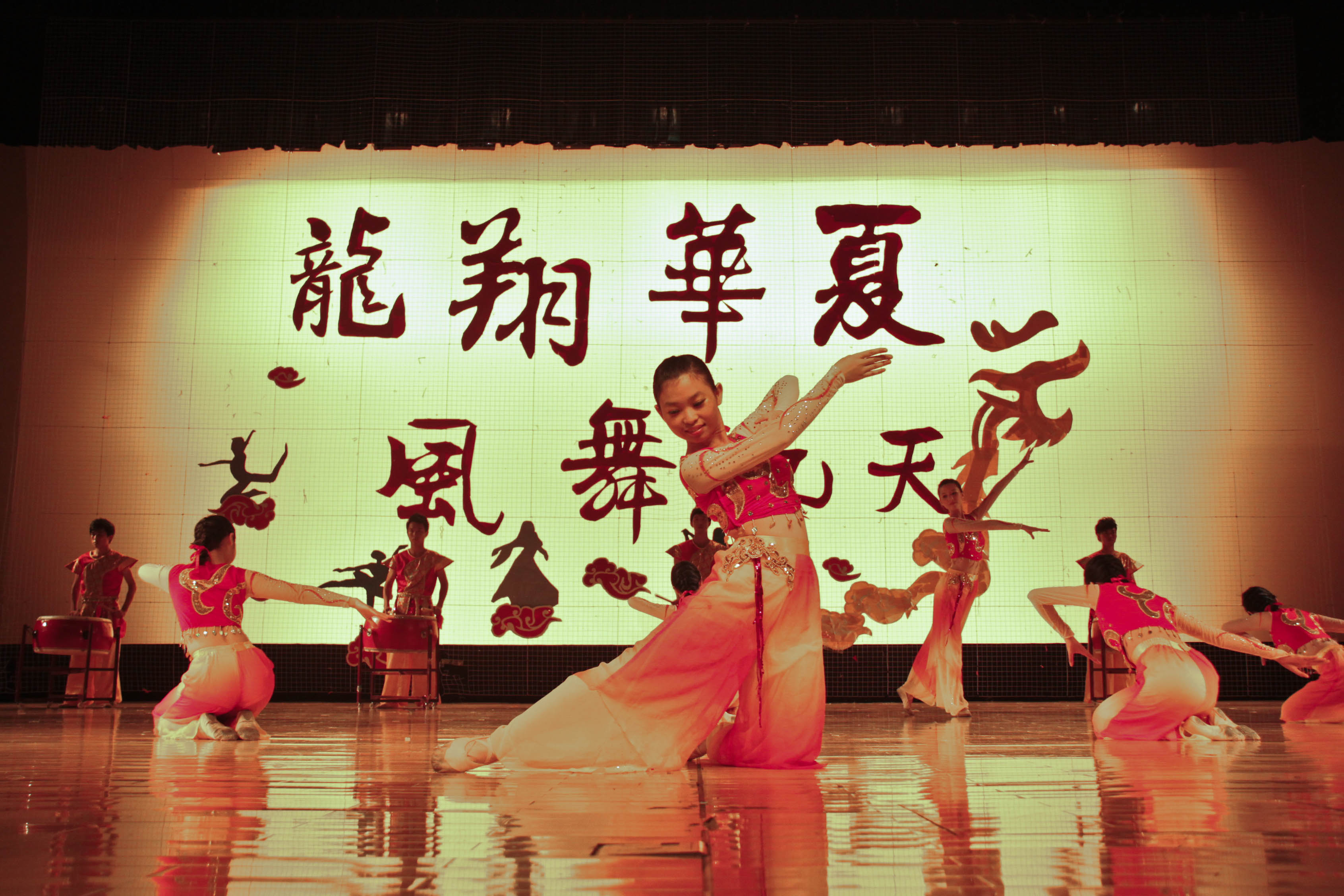 振奋的音乐配以雷动的鼓声,经贸学院的《国风》将中国舞蹈的“魂”和“势”表现得淋漓尽致。男舞者充满力量和阳刚的动作与女舞者柔媚动人的舞姿交融,腾空的跳跃和旋转让现场观众爆出阵阵欢呼和掌声。