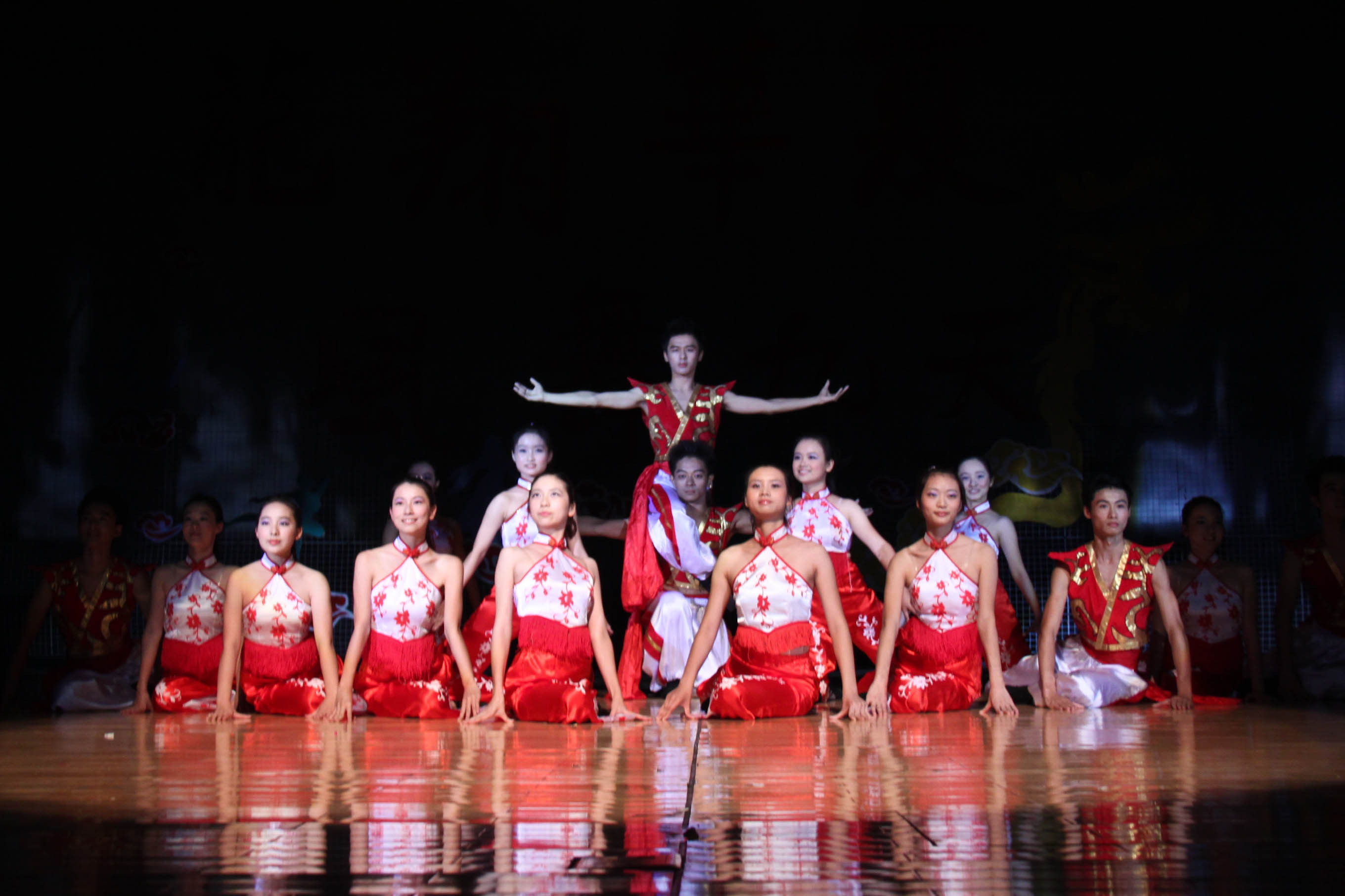 开篇的鼓声带出了财经学院的《龙翔凤舞》,舞者使用红扇整齐的动作和声响给人以恢弘的气势,顿时将现场的气氛引至高点。
