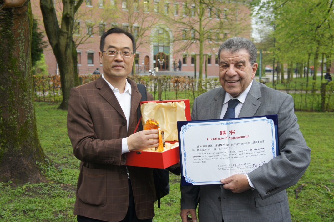 赵军峰与CIUTI主席Lee-Jahnke合影 受校董会秘书处委托,赵军峰向联合国秘书长沙班博士转交我校的校董聘书。沙班博士愉快地接受了证书,并向广外大全体同仁表示感谢和问候。