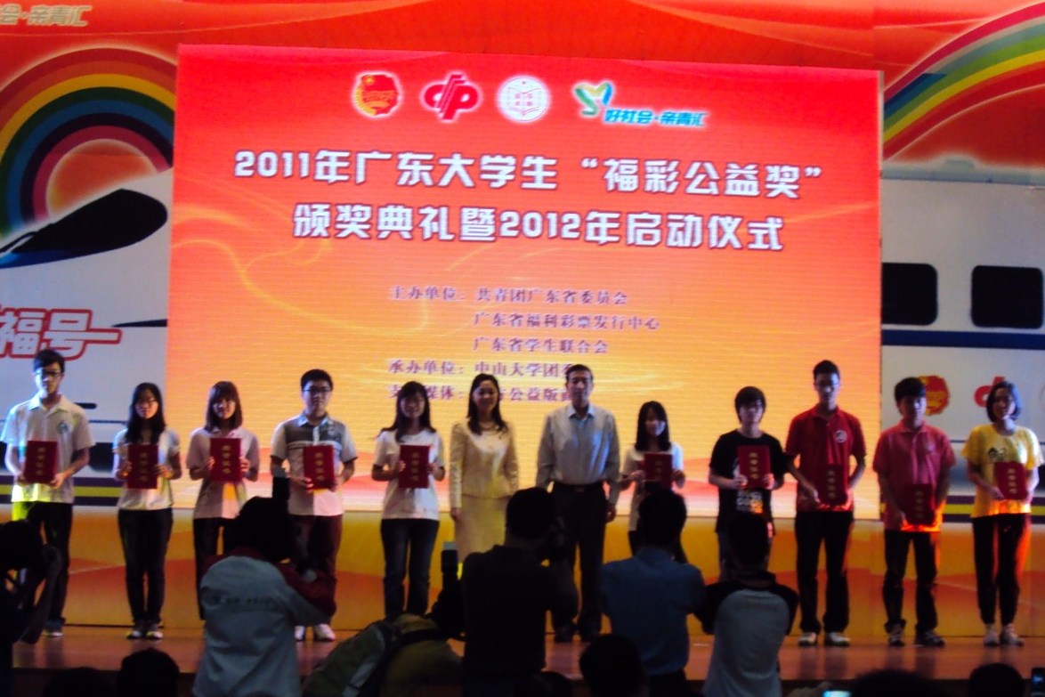 (左5:我校代表、爱的回声志愿者服务队的曾朱玲) 本次2011年“福彩公益奖”投入200万元资金,共评选出300支大学生“福彩公益团队奖”团队和100名“福彩公益之星”,为他们分别提供5500元和3000元活动经费资助。