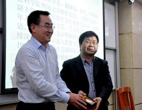 讲座开始前,副校长顾也力上台代表广外给高兴赠送纪念品。