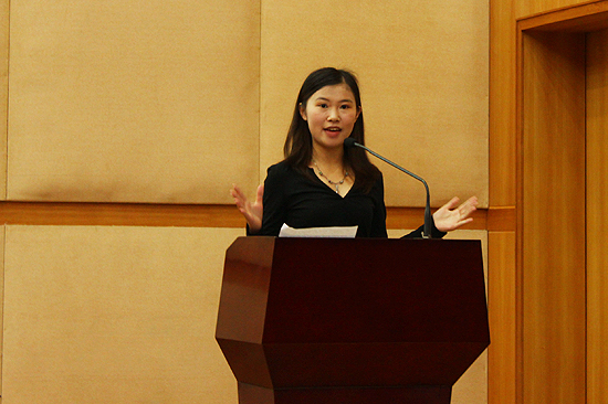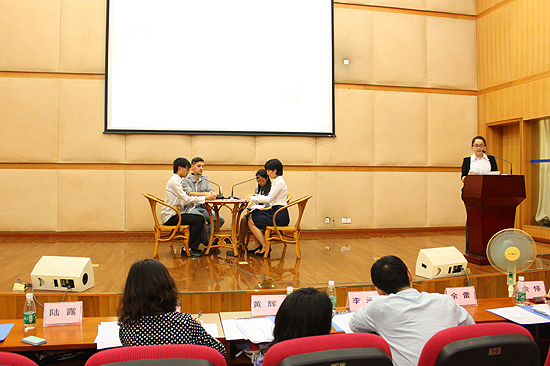 17号专业组队伍“Triad”的比赛题目是“discussion on food safety”。视频翻译的队员流利地翻译了视频里新闻主播对“温家宝痛斥‘瘦肉精’、‘染色馒头’等食品安全事件”的播报,语言简练,声音洪亮,为其队伍赢得了良好的初印象。接下来的中英文嘉宾对话翻译环节,两名队员分别担任英文和中文翻译,互译了嘉宾间关于中国食品安全问题,企业社会责任等方面的交流,表达合理,语言连贯,专业本色尽显。“Triad”在最后以强大的实力晋级了决赛。