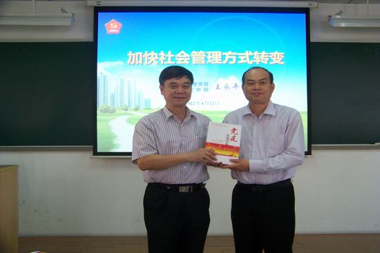 讲座开始,王永平巧妙地以精炼的引言引领大家进入了社会管理的广阔天地。他与大家分享了许多凭借自身丰富的学术经验而凝练的观点,提出“加快社会管理方式转变是加快转变经济发展方式的必然要求,是提高社会管理科学化水平应有之义,也是保持社会和谐稳定的战略举措”。王永平表示:“我们应当充分认识加快社会管理方式转变的紧迫性和重要性以及它的艰巨性和复杂性,毫不动摇地加快社会管理方式转变。”