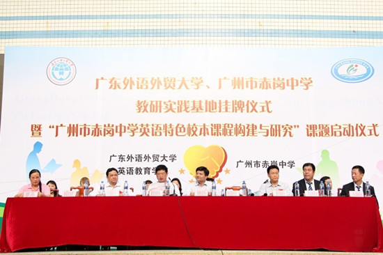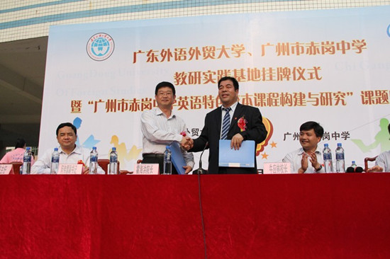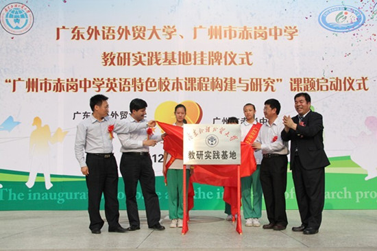 本网讯 4月10日下午,我校英语教育学院与广州市赤岗中学共建教研实践基地挂牌仪式暨“广州市赤岗中学英语特色校本课程构建与研究”课题启动仪式在广州市赤岗中学隆重举行。