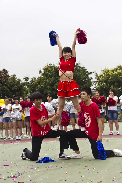 身穿蓝背心、白色短裤的商英啦啦队一出场就引来了阵阵喝彩声,她们给在场观众带来了活力四射的表演;西语啦啦队五颜六色的队服把篮球场点缀得更加亮丽;中文啦啦队中的四名男生更是让人大开眼界。他们摆出的“双飞燕”和“超人”造型引得在场女生阵阵尖叫。四个男生的卖力表演加上女生们的灿烂笑容,使中文啦啦队赢得了最多的掌声的欢呼声。