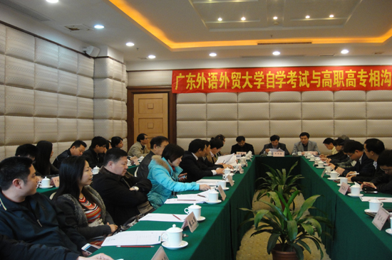本网讯 3月15日上午,广东外语外贸大学高等教育自学考试与高职高专相沟通会议在惠州市南昆山召开,来自广东省18所高职高专院校的代表、7家独立办班教学点和行业协会代表汇聚一堂,共同探讨自学考试相沟通试点工作发展大计,安排部署本学期相关工作。我校副校长何传添、继教(公开)学院院长何勇斌出席了会议。会议由学院副院长任跃忠主持。