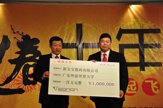 仪式上,新宝宝公司再次向我校捐款100万元,资助我校家庭经济困难学生,许国彬代表学校接受了捐赠,并向新宝宝数码有限公司赠送了纪念品。