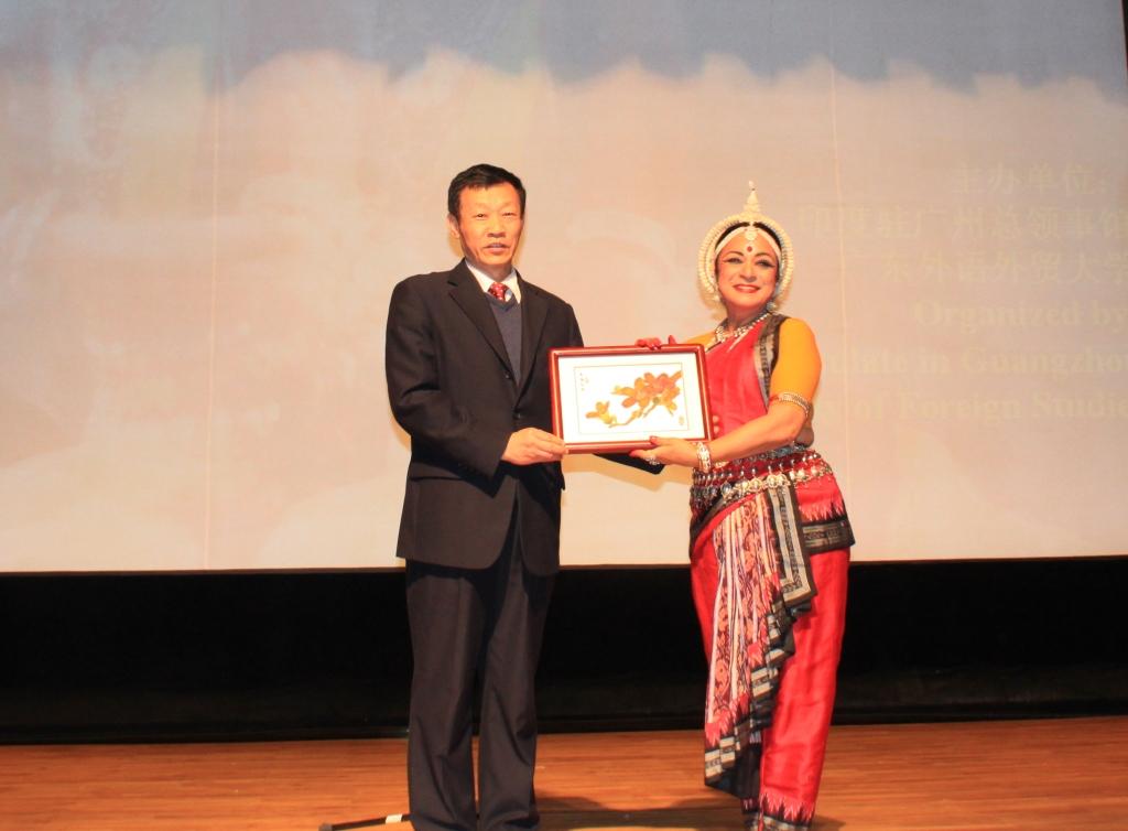 印度驻穗总领事潘迪及其夫人,广州市教育局局长屈哨兵,我校党委副书记许国彬、副校长陈德萍、国际合作与交流处处长焦方太、校团委书记谢秀兰等出席了此次演出。