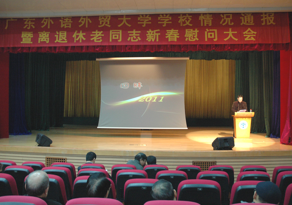 随后,他用“三件大事”、“十大工程”、“一个机遇”这几个关键词向各位老同志通报了学校2011年工作的开展情况。2011年学校完成了三件大事,即接受省委巡视组回访检查;开展岗位设置与人员聘用工作;校领导班子人事变动。省委巡视组对学校扎实有序的工作和取得的进展给予高度肯定。省委巡视组认为,过去的三年是广外抓住机遇,取得大发展的三年,是广外知名度和名誉度不断攀升的三年,是广外各项教育事业大发展的三年。2011年3月,学校基本完成岗位设置与人员聘用工作,成为首个完成岗位设置和人员聘用校内程序的省属高校。此外,2011年校领导班子成员有了较大的变动。董小麟同志、金耀观同志先后因年龄原因不再担任副校长、校党委副书记职务,已办理退休手续;陈子锐同志、曾用强同志前往省内兄弟院校担任院长。