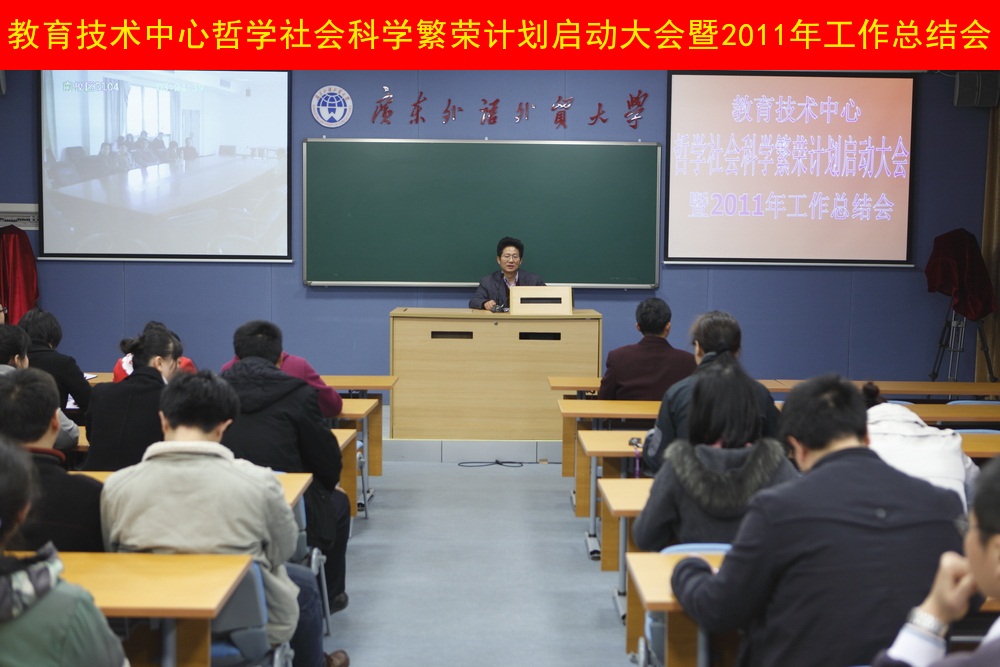 本网讯 1月10日下午,教育技术中心在北校六教A209和南校实验楼D302召开了哲学社会科学繁荣计划启动大会暨2011年工作总结视频大会。会议由乔万林主任主持,教育技术中心全体人员参加了会议。 会议开始,乔万林传达了学校哲学社会科学繁荣计划启动大会暨2012年发展战略研讨会会议精神。详细讲解了隋广军书记主题报告《贯彻落实高校哲学社会科学繁荣计划》中关于繁荣发展哲学社会科学务求重点突破的五大抓手,仲伟合校长主题报告《凸显特色、创新发展、开创我校哲学社会科学繁荣发展新局面》中的特色、重点和未来三点解读,以及《广东外语外贸大学哲学社会科学繁荣计划》所规划的八大体系和六大工程。他特别强调了“建立方便快捷、资源共享的科研条件支撑体系”、“‘云山智库’营建工程”对我校教育信息化发展带来了新的机遇。