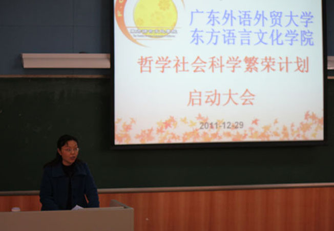 会上,东语学院党委书记敖湘晖首先宣布广东外语外贸大学东方语言文化学院哲学社会科学繁荣计划启动大会开始。她表示,繁荣哲学社会科学计划是未来工作的重点,老师们需要通过回答“我是谁?我在哪里?我要去哪里?我要怎么去到那里?”、“什么是职业幸福观”这一连串问题,为实现哲学社会科学繁荣画上自己绚丽的一笔。针对职业幸福,她表示,全体教师要以科学发展观为指导,既要喜欢又有能力胜任自己的既有工作,积极适应社会组织的需求又要正确处理好家庭与事业的关系,从而实现自己的最大价值。面对工作上的压力,她建议老师们要学习与人分享快乐与痛苦,在工作中通过团结、合作、交流减少压力,快乐生活。