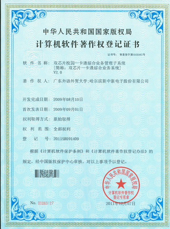 本网讯 我校于2009年投产的新校园一卡通系统,近日荣获国家版权局颁发的两项计算机软件著作权登记证书。