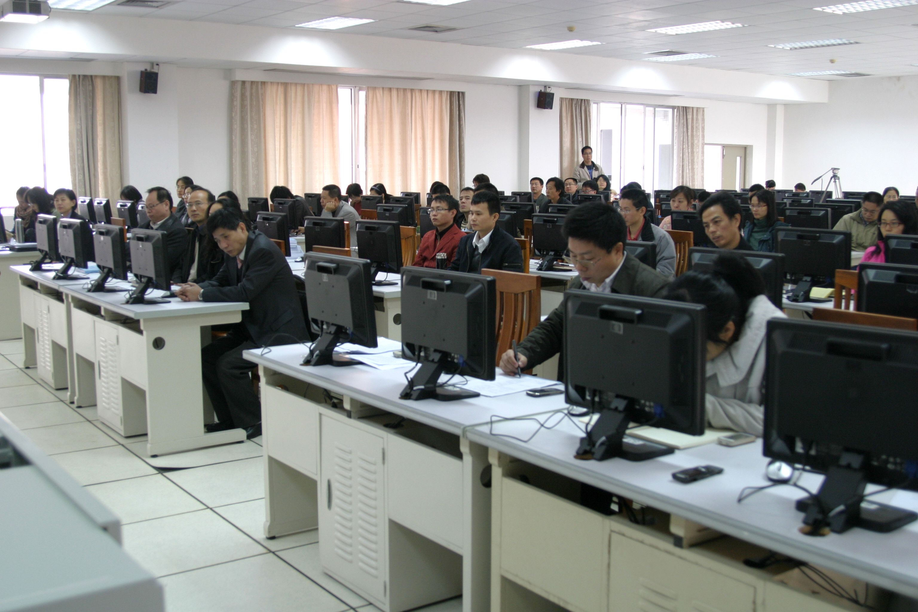 本网讯 12月22日上午,2011年ERP软件及沙盘系统第一期教师培训班仪式在实验楼B座406室举行,平时站在讲台上的老师们以学员的身份坐在学生的位置上。各学员在开班典礼结束后,率先参观了南校的ERP软件及沙盘系统实验室,并开始了第一期的培训。