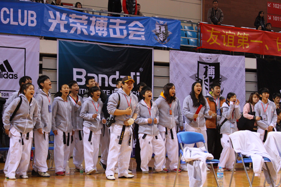 不过接着男子甲组54KG级的比赛中,我校选手陆海鹏的出场将场上气氛推向了最高潮。经过前几轮比赛后陆海鹏出现了轻微的伤病。决赛时,他自信冷静,连续使用下劈、高鞭腿等高技术性动作,连击对方头部将比分拉到8:1。虽然后来对手展开凶猛进攻并一度被击中受伤部位,但他仍咬牙坚持,以15:3的优势取得了分差胜。观众的欢呼声更顿时淹没了广外体育场馆。