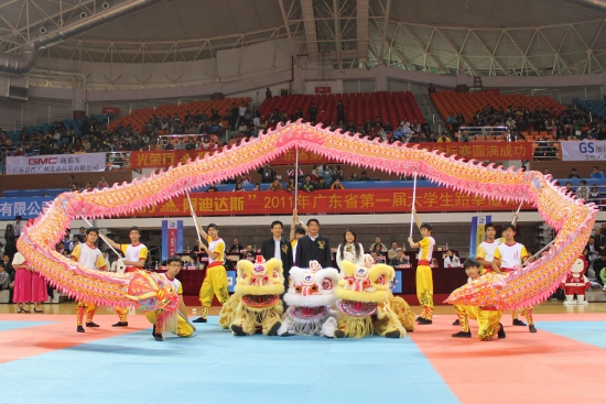 运动员,裁判员宣誓后,开幕式表演正式开始。华南农业大学柔功门龙狮队的龙狮表演一出场就吸引了观众的眼球。在陈子锐、陈华忠、王奇欣为狮子点睛后,洪亮的锣鼓声响彻体育馆。传统舞龙来回旋转,灵巧的狮子追逐打闹,舞者头顶同伴肩膀,双脚悬空高挑等高难度动作博得阵阵掌声。醒狮眨眼活灵活现,令人忍俊不禁。醒狮落地前口吐“马到功成,学业进步,万事如意”的对联,让场馆洋溢着喜庆气息。