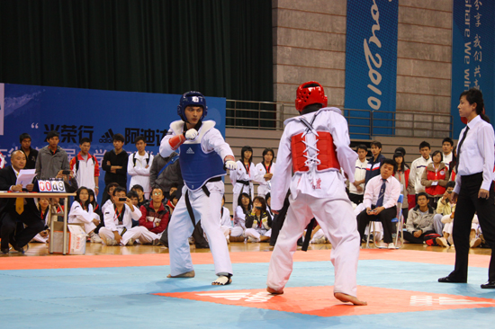 男子方面,陆海鹏等领衔的广外男队誓要捍卫广外的主场荣誉。较早出战的吴晓东在男子甲组62公斤级比赛一路过关斩将地杀入四强。虽然腰部伤势大大影响了吴晓东的发挥,但他顽强地与对方展开周旋,场上比分交替上升。战至7:9时,令人揪心的一幕发生了:双方一次前踢踢到一块,站立不稳的对手顺势倒在吴晓东身上。痛苦倒地后的吴晓东碍于伤势加重,无力挽回两分的劣势而止步四强。