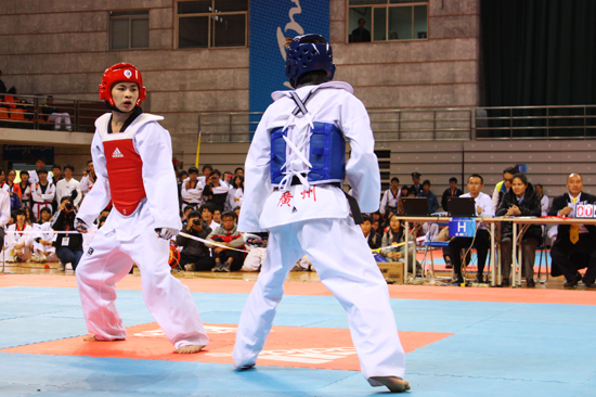 在开幕式表演结束后,就开始了本次大赛的跆拳道品势比赛。跆拳道品势是指练习者以技击为主要内容,通过攻守进退的动作编排,达到强身健体、锻炼意志目的的一种练习方式。我校男子品势选手何家健、吴晓东双双闯入个人品势决赛,并取得了亚军和第五名的好成绩,而男团品势更是夺得了冠军。而女子品势比赛中,我校选手薛依、刘珊珊也巾帼不让须眉,为学校拿回了个人赛冠、亚军,团体赛冠军的荣誉。