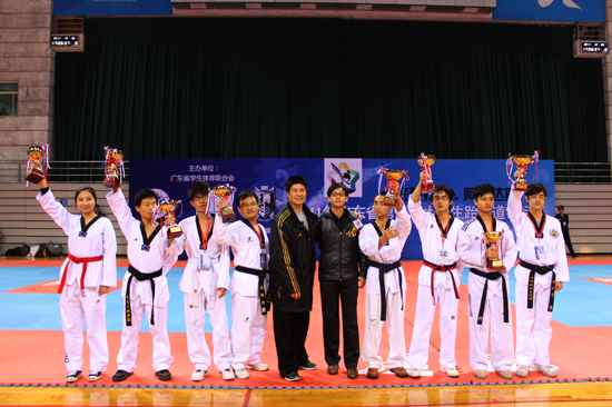 竞赛结束后,广东省体育厅体卫艺处林子平先生,Adidas公司BMC市场经理杨建锋先生,广州韩人商工会会长、广州韩人体育会会长尹镐重先生、我校体育部主任林少娜等人出席了此次“光荣行•Adidas杯”2011年广东省第一届大学生跆拳道锦标赛闭幕式暨颁奖仪式。