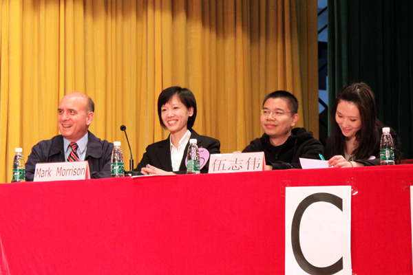 比赛进入第二部分,竞争愈演愈烈。正反双方的辩手和译员都使出浑身解数,其中反方二辩伍志伟和6号译员谢庭贞可谓是最佳拍档。伍志伟言辞犀利又不失风趣,不时引得全场大笑。谢庭贞才思敏捷,能流利地将伍志伟的诙谐语句恰到好处地翻译出来。她巧妙地将蔡永康的名句“你不可能在看电视时看得出深度,除非你想看出深度近视”翻译成“You cannot get real culture from watching TV, all you can is probably eye disease.”。连正方二辩Fred 都竖起大拇指表示称赞。
