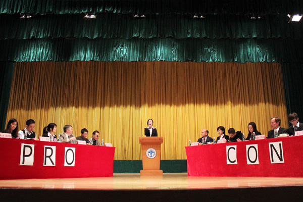 赛场上,正方辩手分别是许罗迈、王栋、Amy Werbel和Fred Lane,宋林、伍志伟、Robert Tindol和Mark Morrison则为反方辩手。随着主持人揭开辩题的面纱——广电总局在34个卫视实行“限娱令”是利大于弊,还是弊大于利,正方一辩许罗迈开始陈述他的观点。他指出,“限娱令”能有效地减少电视节目如《非诚勿扰》中低俗文化和拜金思想的传播。话音刚落,1号译员霍锦琛立刻抓起话筒翻译,当碰到《非诚勿扰》女嘉宾马诺的名句“宁愿坐在宝马车里哭,也不愿意坐在自行车上笑”时,他淡定从容,将其翻译成“She would rather cry, sitting in a BMW than smile, sitting at back seat of a bike.”,激起台下一波热烈的掌声。