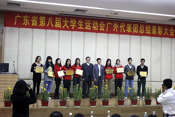 本网讯 12月15号下午,广东省第八届大学生运动会总结表彰大会在北校图书馆负一层举行。我校党委副书记许国彬,副校长、广东省第八届大学生运动会广外代表团团长刘建达,学生处处长、副团长植秀聪,教务处处长、副团长詹文都,广外代表团秘书长、体育部主任林少娜等出席了本次会议。许国彬和刘建达分别为获奖的运动员进行颁奖。