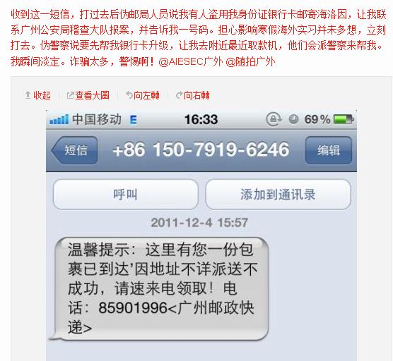 微博“大学城周Sir”的博主是华南理工大学的驻校民警,他会时常发布有关大学城安全的微博。记者从他的微博中看到,大学城的安全情况也不容乐观,多所大学时有学生被盗事件发生,短信诈骗问题也很严重。前段时间,广州大学城就有许多师生接到了“包裹有毒品”的短信。短短四十天,诈骗歹徒“收获”18万。