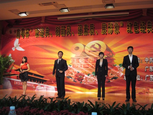 本次比赛由中共广东省委教育工委、广东省教育厅主办。来自广东省各高校的20支队伍参加此次比赛。来自我校新闻学院的钟严、刘畅、周颜、雷衎组成的参赛队伍朗诵节目为《永不褪色的记忆》,“为人进出的门紧闭着,为狗爬出的洞敞开着!”选手们用高亢的声音表达了对党对祖国深切的爱,饱含感情的声音感染着现场的每一位观众。