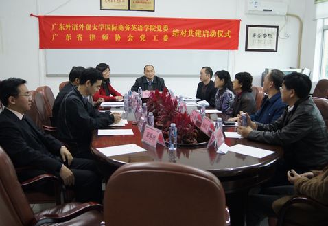 本网讯 日前,国际商务英语学院党委与广东省律师协会党工委结对共建启动仪式在我校举行。广东省律师协会副秘书长徐敏彪、校党委常委、组织部部长卢景辉,商英学院党委书记车小真、主持工作副院长郭桂杭、商英党委全体委员及法英系党支部教师代表等出席了启动仪式。