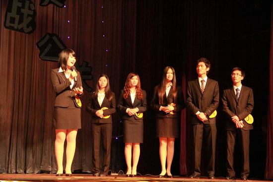 出席本场大赛的有管理学院院长钟育赣,政管学院党委书记范静静,校团委副书记陈兵,政管学院副院长肖鹏军、党委副书记邵兵,新闻学院副院长刘超以及四位参与公关大赛策划的事业单位代表等。本次大赛分为形象管理、方案展示、公关大考验三个环节。总成绩由65%的初赛成绩和25%的决赛成绩决定。