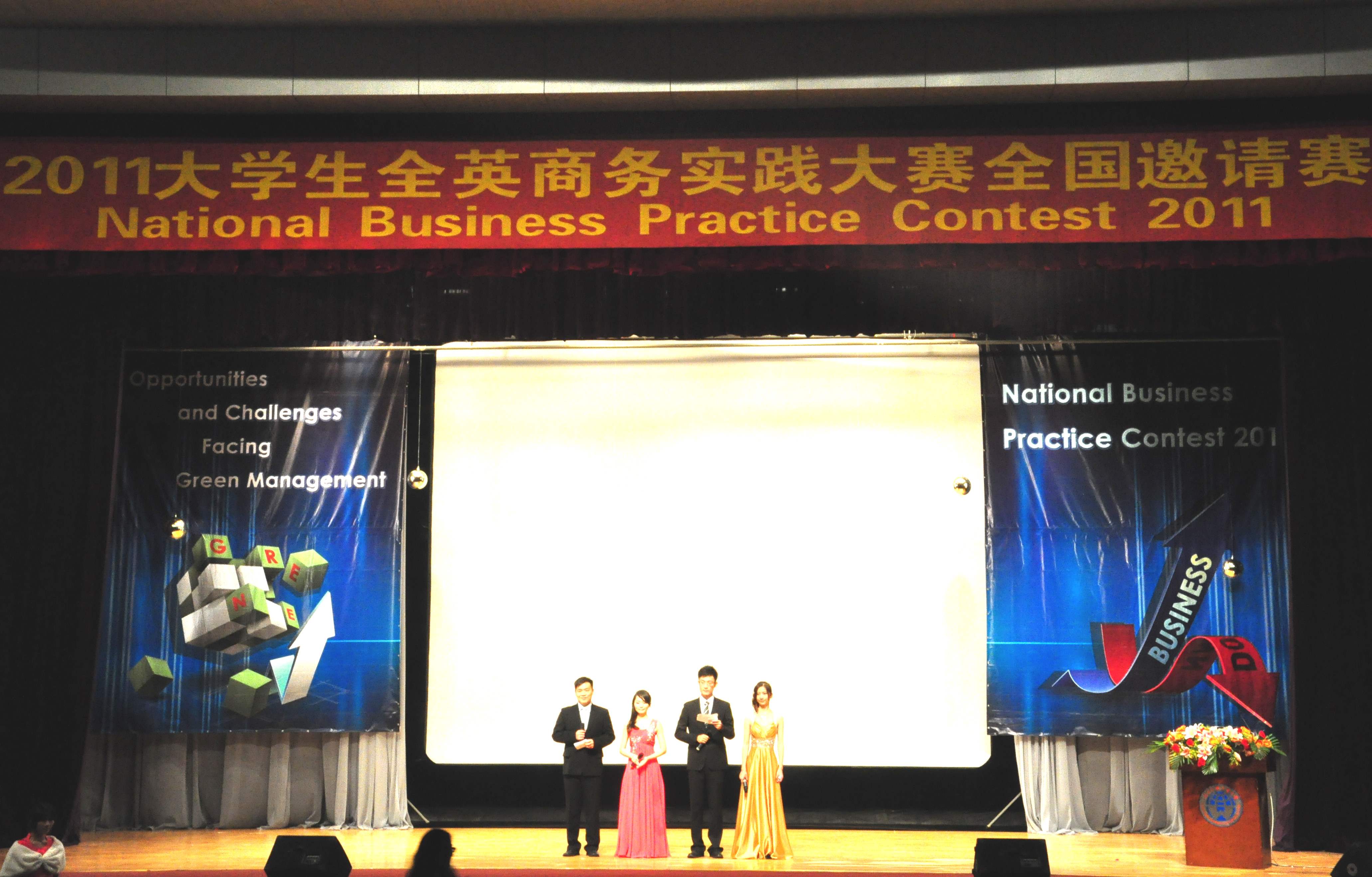 本网讯 11月26日晚,第一届大学生全英商务实践大赛全国邀请赛在北校云山会堂举行。来自上海对外贸易学院的Big Bang,来自西南财经大学的Greight,来自对外经济贸易大学的Being,以及来自广东外语外贸大学的Halo,这四支精英队伍,汇聚在同一个舞台上,各出奇招,实践商务,演绎不一样的精彩。