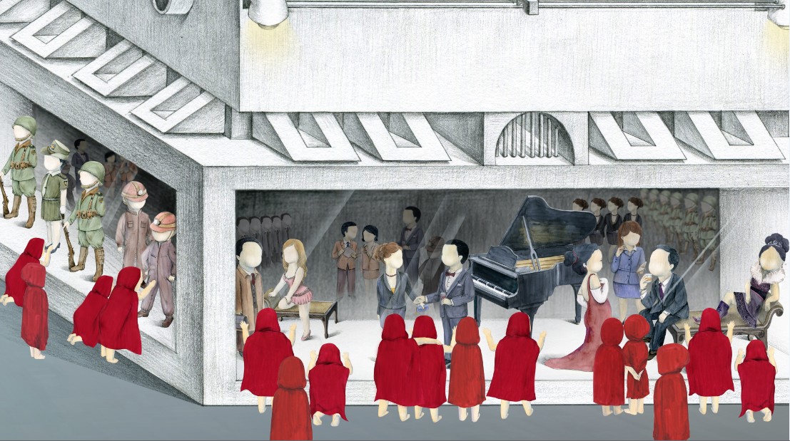 一个个披着红斗篷的小雪人奔跑在森林里,没有影子的他们单纯而快乐。直到有一天,小雪人们通过一堵墙看到了墙外五彩缤纷的世界,美丽的衣服、琳琅满目的各式商品。小雪人们忍不住好奇心翻过了那堵墙,从此他们有了影子。影子强迫他们做各种各样繁琐的工作,从前的单纯快乐消失不见了。最终,小雪人们被毁灭,尸体堆成一个游乐园。