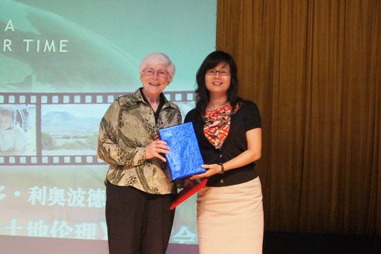 苏珊.弗莱德博士赠予我校图书馆五本由奥尔多·利奥波德执笔的被誉为“绿色的圣经”的著作《沙乡的沉思》,商英学院则回赠荣誉证书以表谢意。