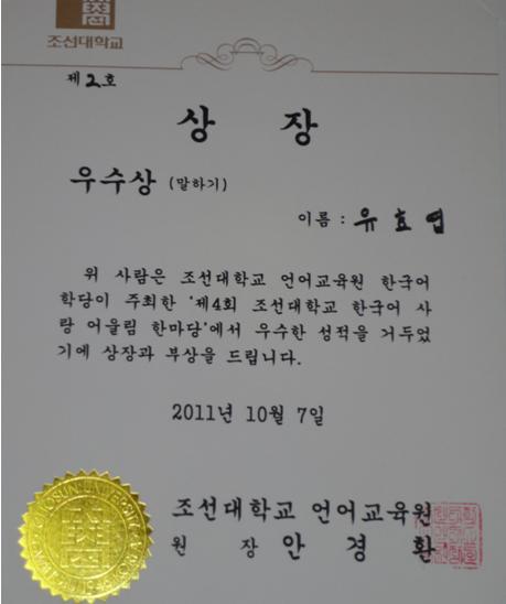 经过两个小时的激烈角逐,我校其中的3名参赛选手欧燕、刘晓烨、冯仕柳分别获得此次大赛的一等奖(대상)、二等奖(우수상)和三等奖(장려상)。