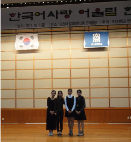 本网讯 10月7日,韩国朝鲜语大学语言教育学院第四届韩国语演讲大赛在朝鲜大学举行。来自中国、越南、巴基斯坦、俄罗斯等国家共24名选手参加了这次比赛。我校东语学院韩语系09级学生满载而归,囊括冠军、亚军和季军。