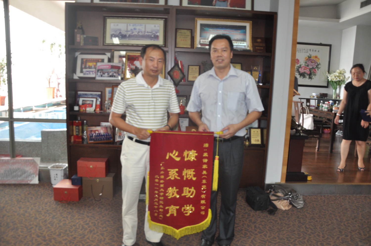 本网讯 9月28日上午,研究生部(处)一行6人前往东莞,拜访我校“荣锋研究生奖学金”的捐赠者东莞昱盛家具有限公司董事长麦林昌。研究生工作部部长康为茂、研究生处处长袁泉、昱盛家具有限公司助理总经理陈伟坚等出席了本次活动。 双方的见面会以轻松的座谈交流形式进行。首先,康为茂转达了副校长方凡泉、石佑启等对昱盛家具有限公司及麦林昌的感谢,并邀请他到我校参观访问。期间,康为茂代表我校向麦林昌赠送“慷慨助学,心系教育”的锦旗,以此表达对东莞昱盛家具有限公司“情系广外、助教帮学”善举的感谢。