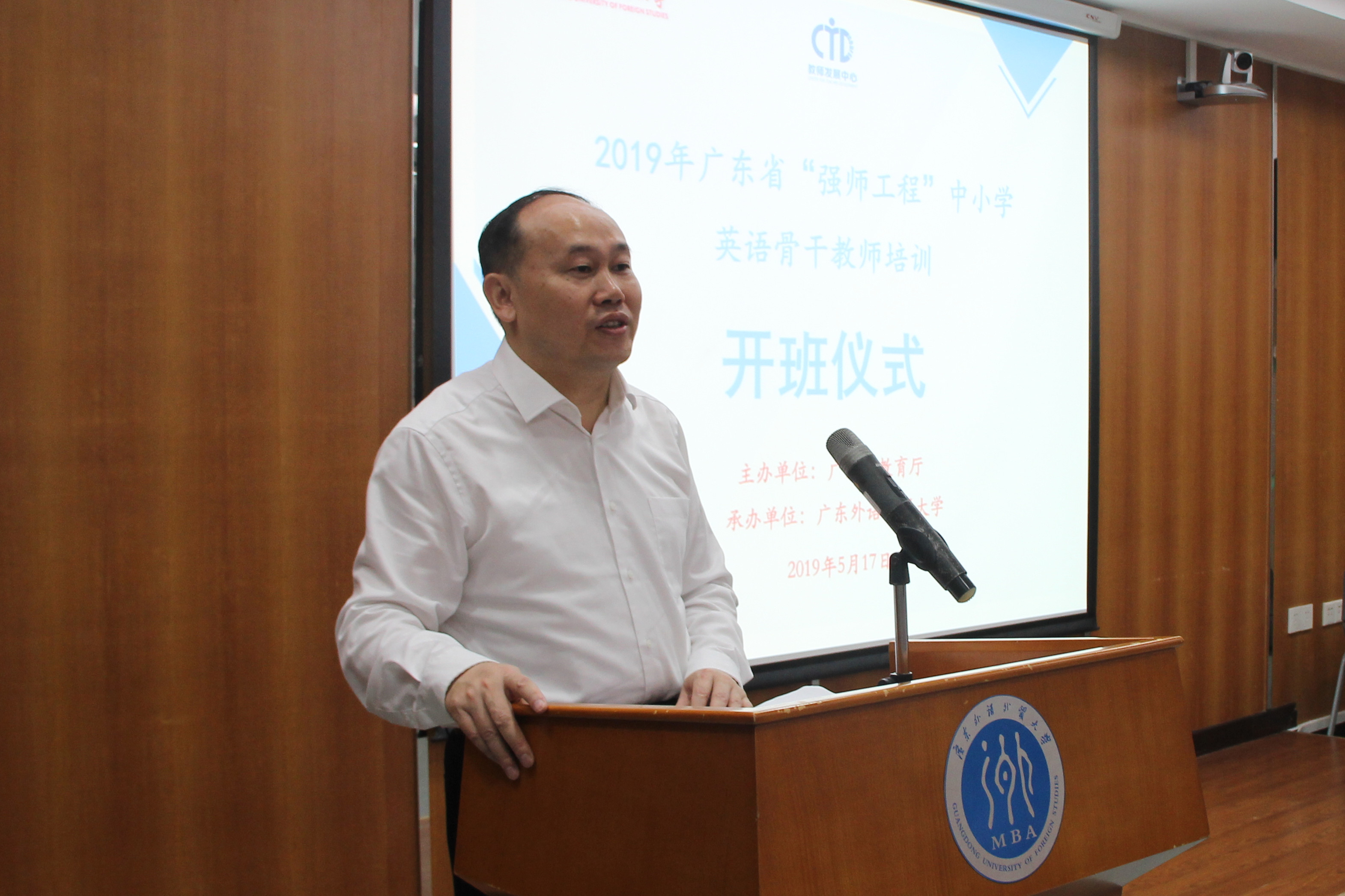 本网讯 5月17日上午,广东省“强师工程”中小学英语骨干教师培训班在北校区第九教学楼306举行开班仪式。我校副校长阳爱民为开班仪式致辞。来自广东省各地中小学的49位英语学科骨干教师出席仪式。