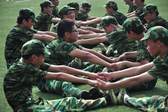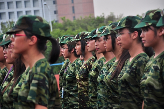 只要站在这里,我们就是军人 “脚跟内扣,双脚成60度,腰挺直,挺胸收腹,双手要垂下,手掌紧贴两边裤子,四指并拢,昂首挺胸。”每天早晨都要保持半小时立正的姿势站军姿,腰酸背疼、脚底起泡、全身冒汗是众多新生一天的写照。即便腰腿酸痛不已,但新生们一刻也不懈怠,管理学院物流专业的小倩同学说:“双脚再累、再酸,都得静静地把苦水往肚子里吞,因为,站在这里,我们就是军人!”