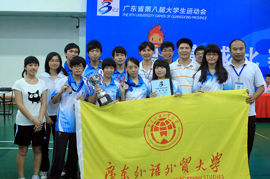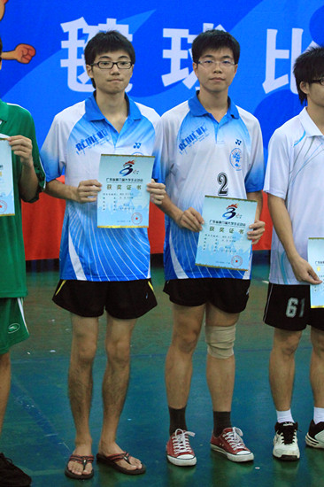 本网讯 9月4日,历时三天的广东省第八届大运会毽球赛在广工体育馆落下帷幕。我校获得乙组团体积分排名第二,高敏、邝桂文获女双铜牌,吴曼婷、周洁玲获女双第五名,周洁玲获女单第五名,陆桂刘梓翰获男双第七名。