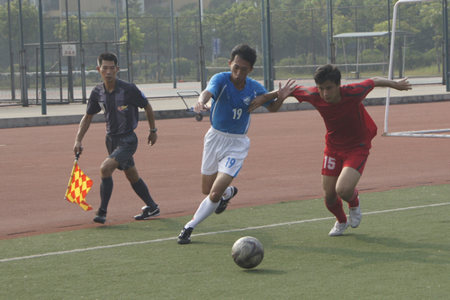 本网讯 8月30日早上,广东省第八届大学生运动会足球小组赛末轮在中大大学城校区人造草场进行。广东外语外贸大学男足迎来了在本次小组赛的最后一个对手——广商。上半场广外连下三城遥遥领先,下半场被广商扳回一球,最终广外以3:1的比分拿下了本场比赛,并以小组第二的成绩出线。