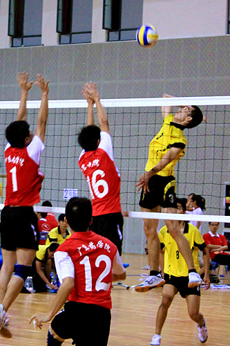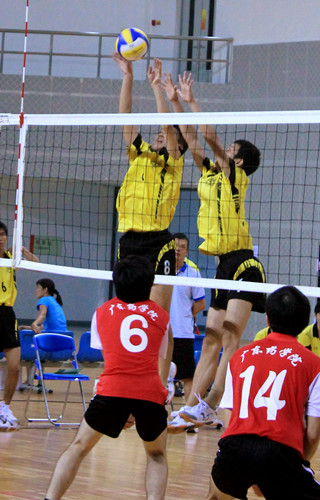 本网讯 8月29日上午,省大运会男排甲D组的比赛在中山大学体育馆继续进行,我校男排队对战广东药学院,最终以3:1胜广药队。