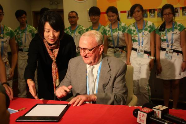 基里安在刘燕的指引下在深圳大运会赛会志愿者证明书上签名