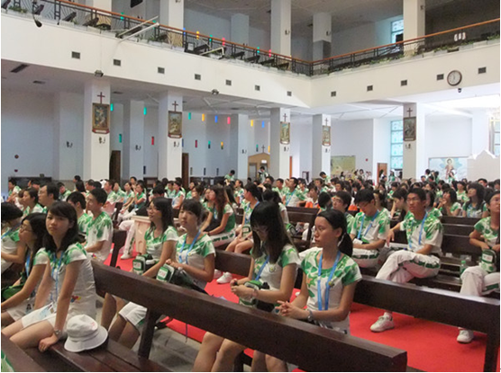 志愿者们在天主教深圳圣安多尼教堂听工作人员讲解天主教知识